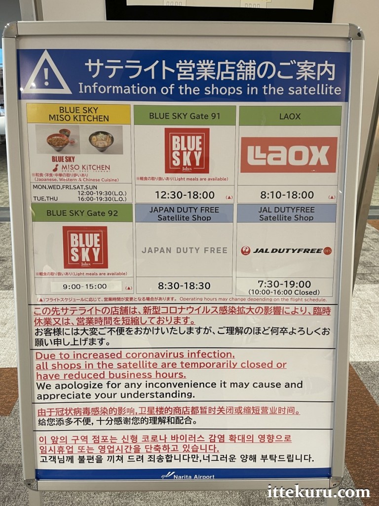 Outbound security and immigration were pretty much as I remembered from pre-pandemic days. The big changes airside were of the same kind as landside: closed shops, limited dining options, restricted hours for those few places still running. I neglected to photograph the notice describing which places were operating in the main building, but at least one large duty-free shop was in service (along with a small number of luxury boutiques).
