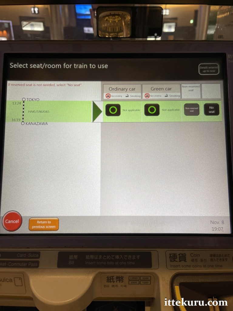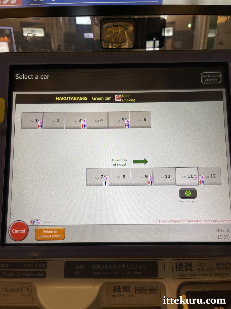 If you have an Ordinary JR Pass, the only available option will be “Ordinary car” (economy class). If you have a more expensive Green JR Pass, the machine will allow you to select either “Ordinary car” or “Green car” (first class). Tap on the black button corresponding to your chosen class of travel.