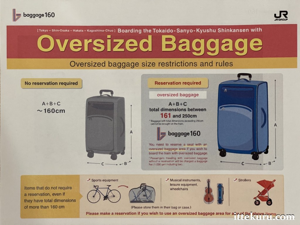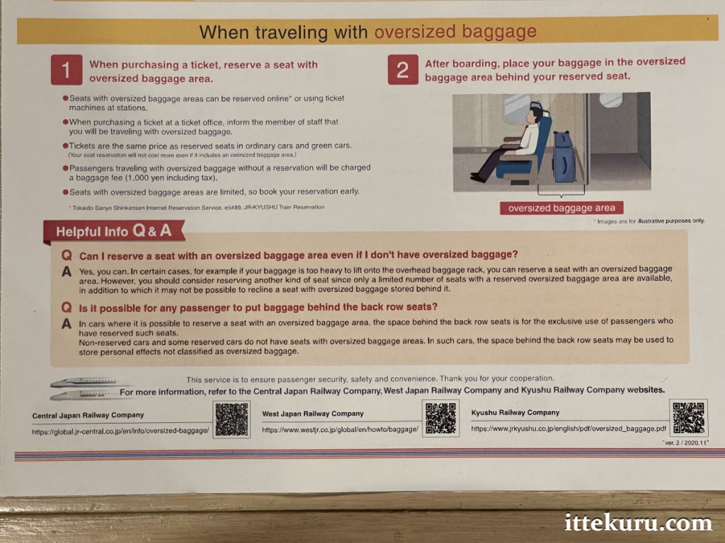 In a broad sense, there’s really only one new rule. If you want to bring oversized baggage aboard a Tōkaidō, San’yō, or Kyūshū/Nishi-Kyūshū Shinkansen service, you’ll need to reserve a “seat with oversized baggage area”.