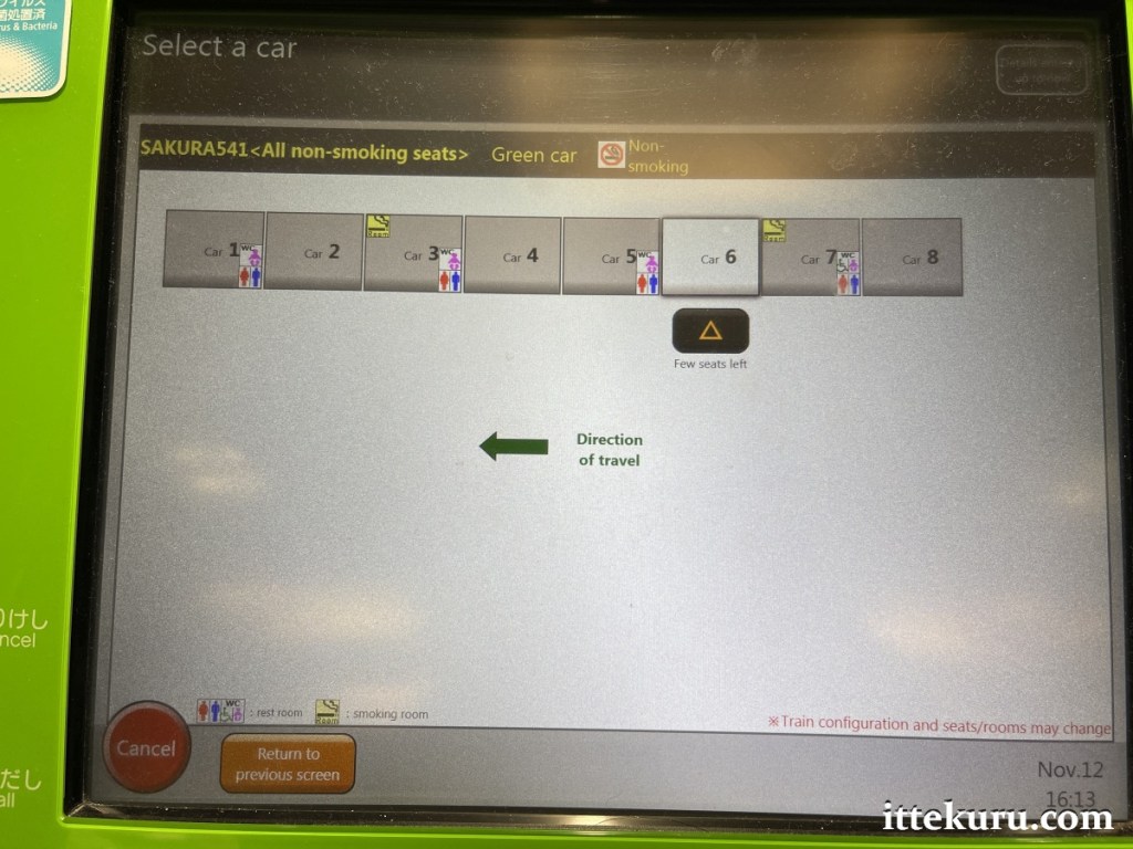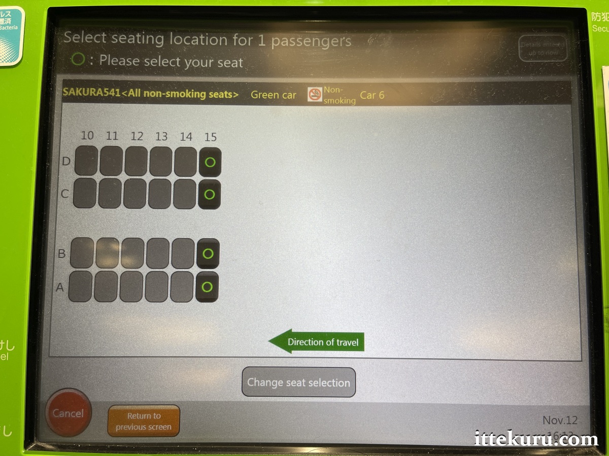 Vacant/available seats are marked with black buttons. Greyed-out seats are occupied/unavailable. In this case, since you’ve indicated earlier on that you’re booking a seat with oversized luggage space, the machine will only allow you to choose from amongst seats in the last row (whether or not there are vacancies elsewhere in the car).