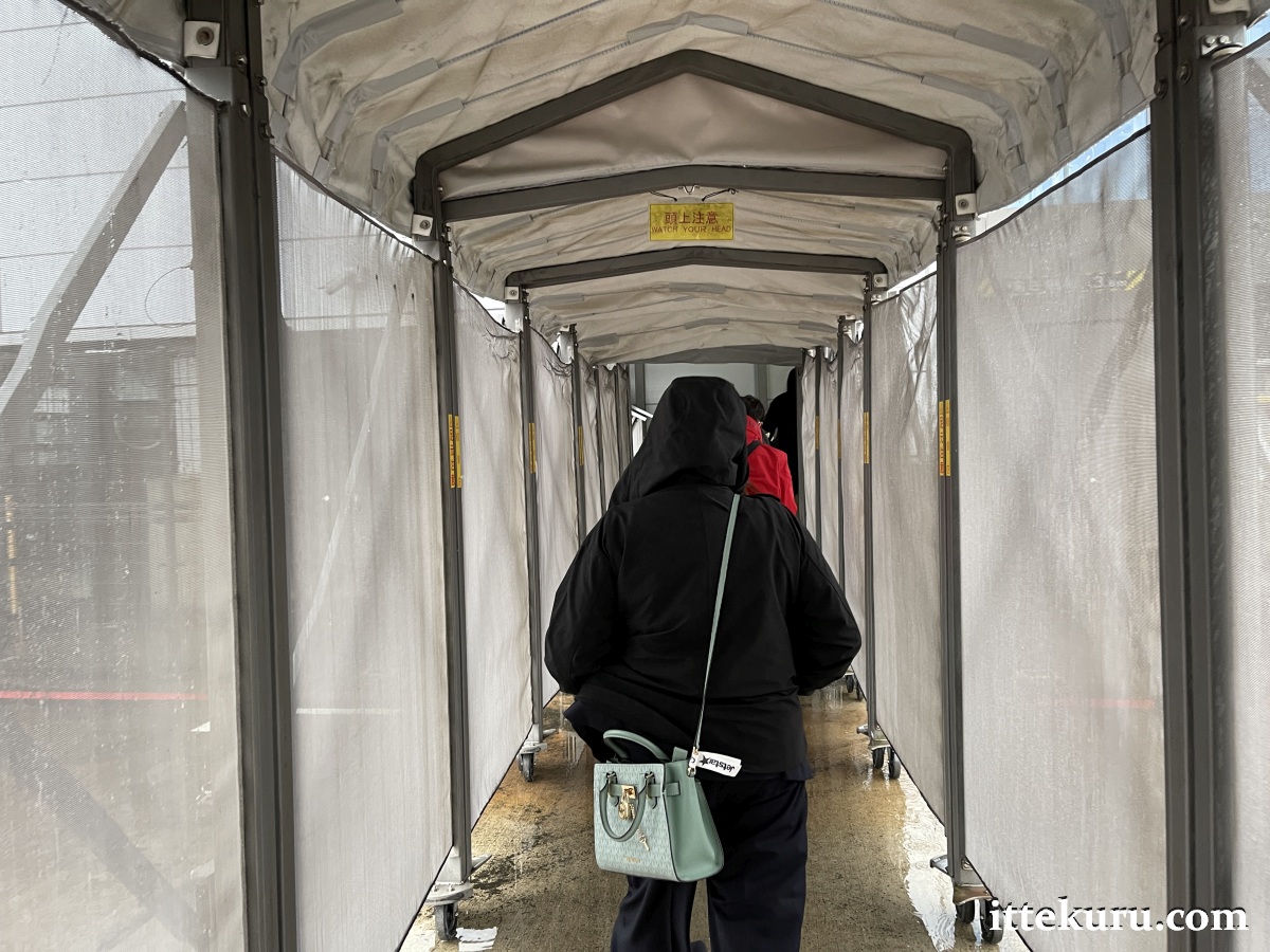 Fortunately, NRT T3 is in a better class of budget terminal and strives to offer a good passenger experience – or, at the very least, a less-unpleasant passenger experience. In our case, we’d arrived in the middle of a rainstorm and were herded through a collapsible sheltered corridor, whereas normally (i.e., in better weather) we’d have walked across the terminal apron out in the open. You’ll also note in the first picture below that a special truck with a lifting cabin had been deployed to allow disabled passengers to easily get off the aircraft.