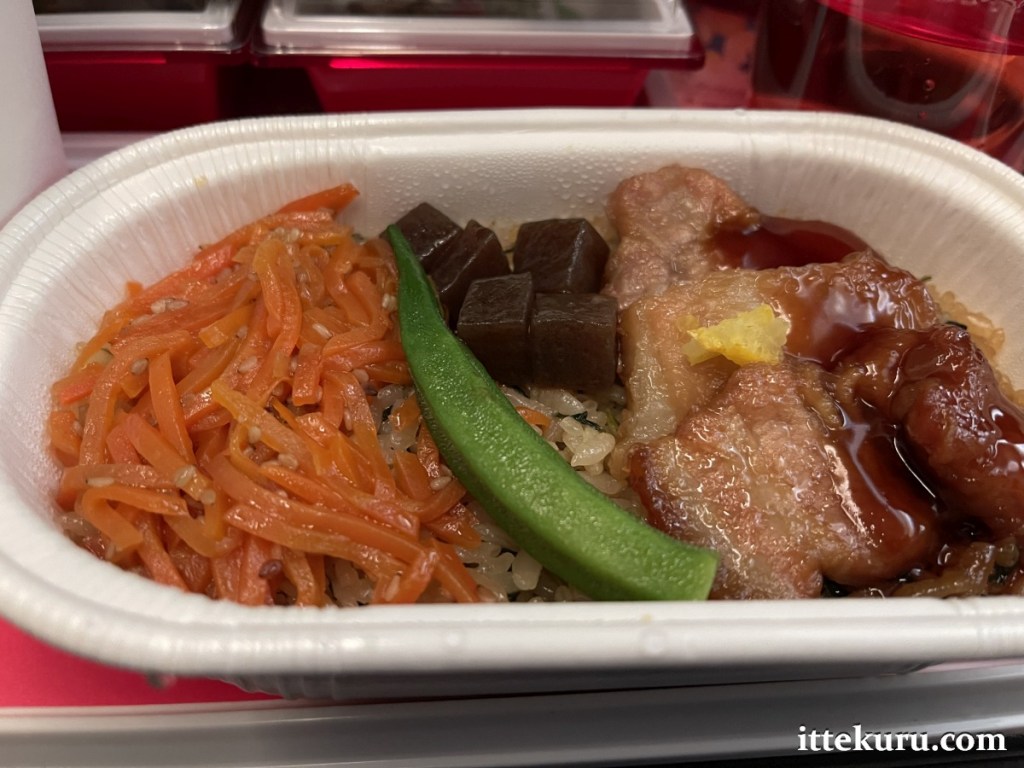 | お食事 [3/1-15・4/1-15] 豚ばら照り焼き 人参金平と青菜ご飯 [3/16-31・4/16-30] チキン味噌デミグラスソース ごぼうバターライス 蒸し鶏蓮根サラダ 香草ソースがけ 厚揚げ豆腐 湯葉餡かけ ブロッコリーとイカの梅おかか和え フレッシュサラダ ドレッシング添え ハーゲンダッツ アイスクリーム コーヒー、紅茶、緑茶 | Menu [3/1-15・4/1-15] Pork Rib Teriyaki, Sautéed Kinpira-style Carrot, Rice with Daikon Radish Leaves [3/16-31・4/16-30] Chicken with Miso Demi-glace Sauce, Buttered Rice with Gobo Burdock Root Steamed Chicken & Lotus Root Salad Garnished with Herb Sauce Deep-fried Tofu with Savoury Yuba Starchy Sauce Broccoli & Squid Dressed with Pickled Japanese Plum & Bonito Flakes Fresh Salad with Dressing Häagen-Dazs Ice Cream Coffee / Tea / Green Tea |